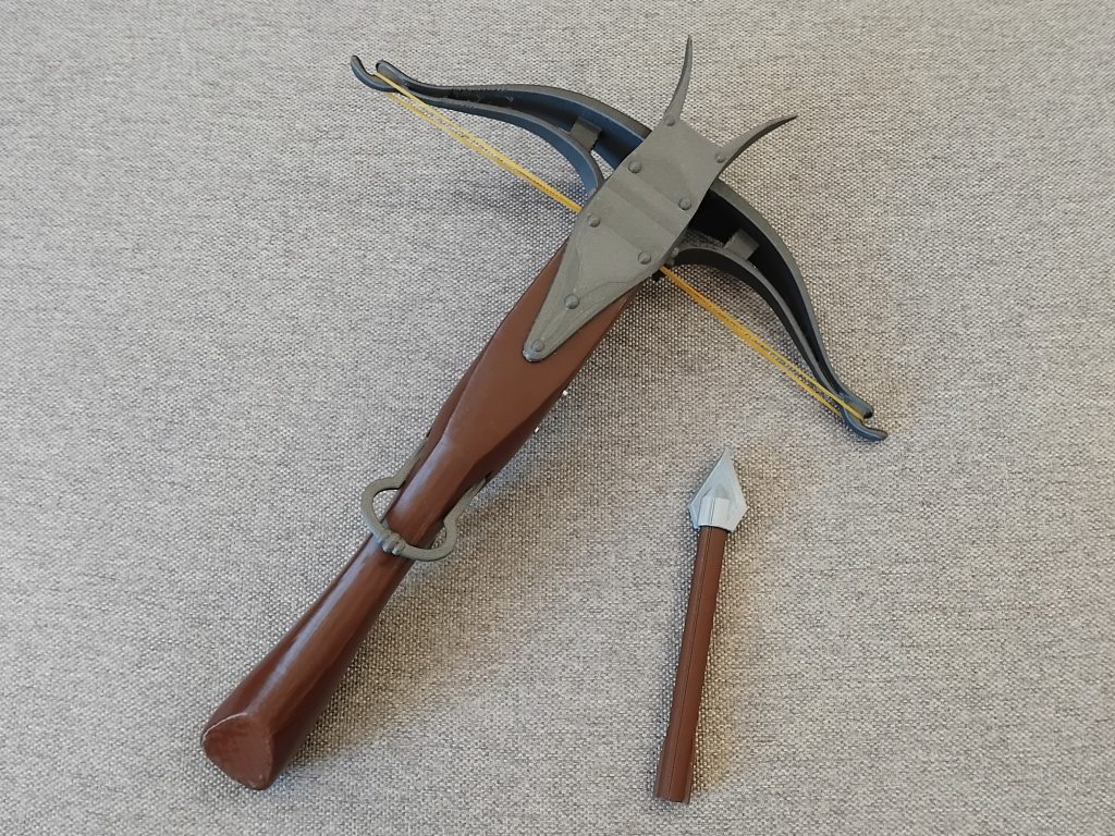 Принтиране и сглобяване на модел по поръчка като косплей аксесоар. Оригинално може да стреля с NERF патрони. Араблетът е принтиран в 75% размер за да е по компактен и може да изстрелва моливи и химикалки. Стрелата моделирахме ние, като реквизит за снимки. Стрелата влиза плътно и не може да бъде изтрелвана и съответно не изпада.