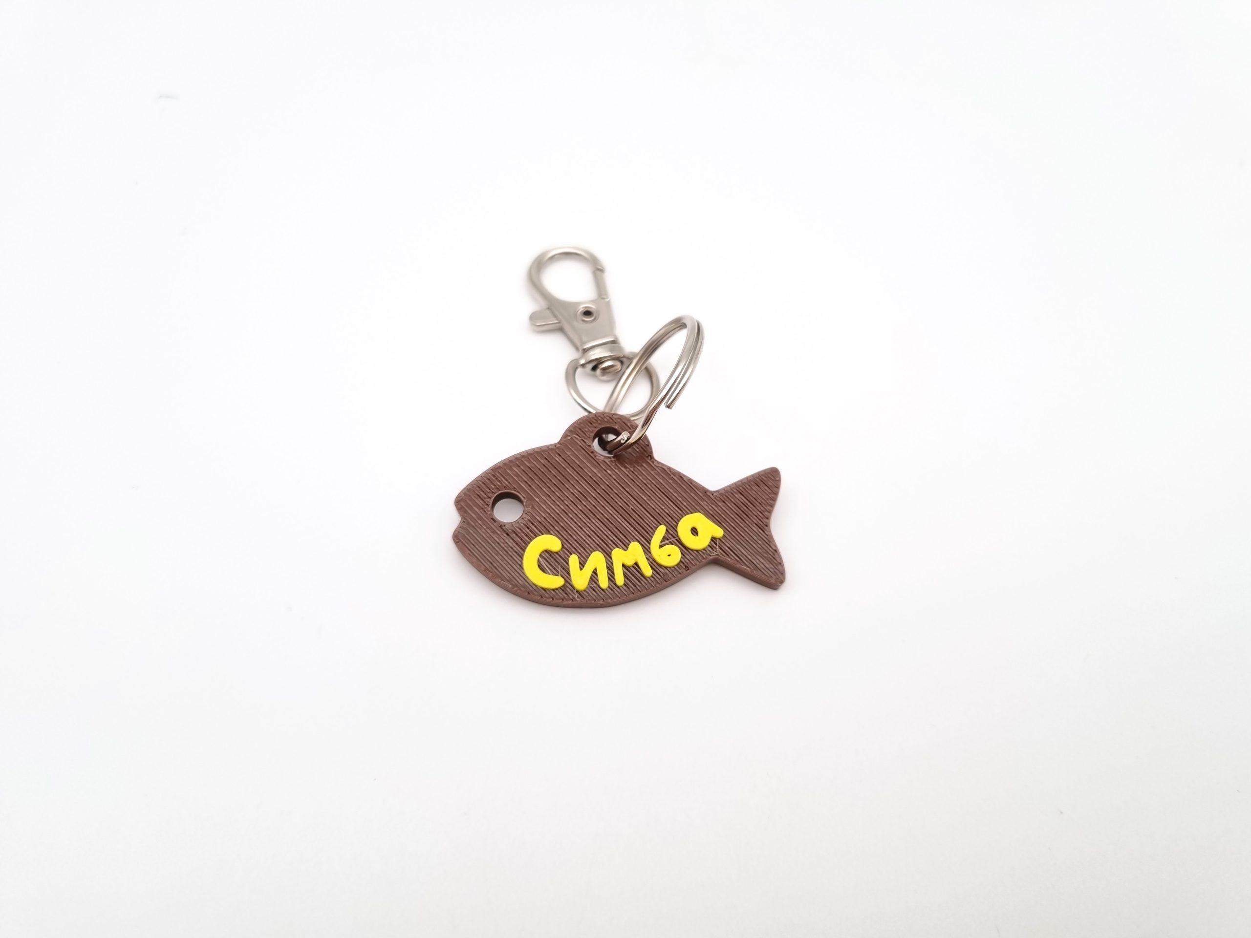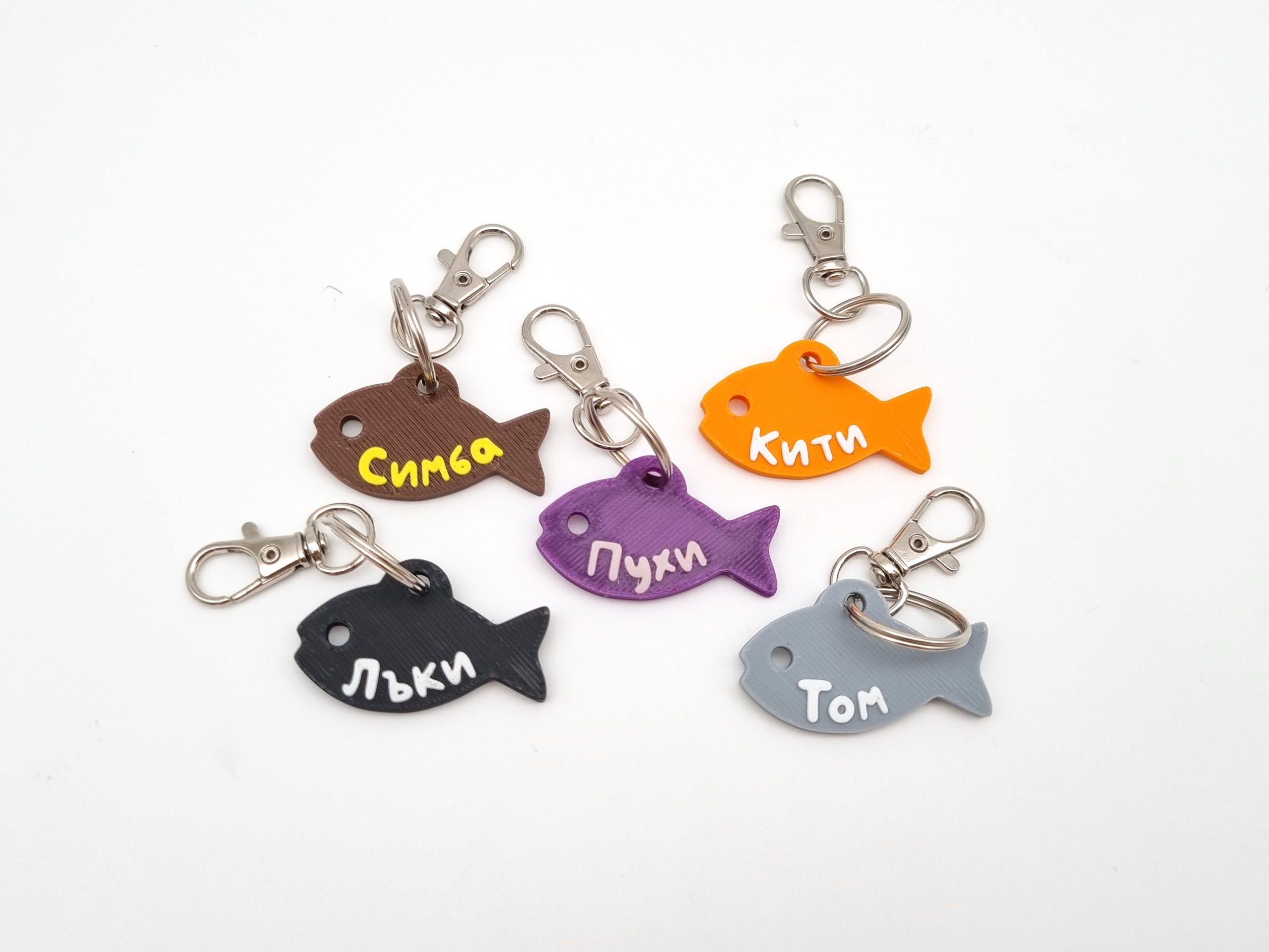 Ключодържател рибка с име, медальон за коте или табелка с име и/или телефонен номер. Подберете цветовете така, че да подходят на вашия домашен любимец. Окачете на нашийника за да си носи името. Закачете на ключовете за да се усмихнете всеки път, когато извадите ключовете.