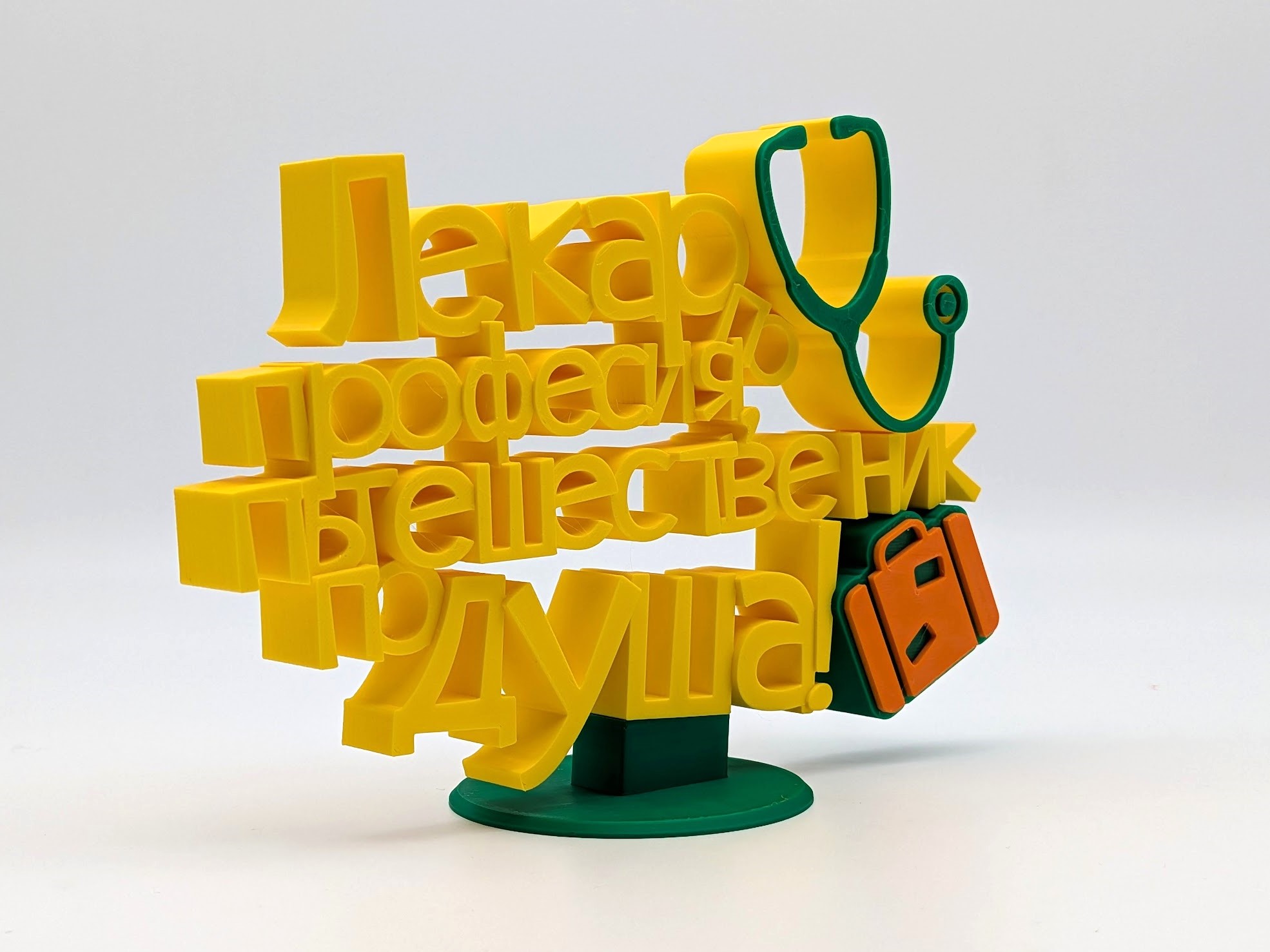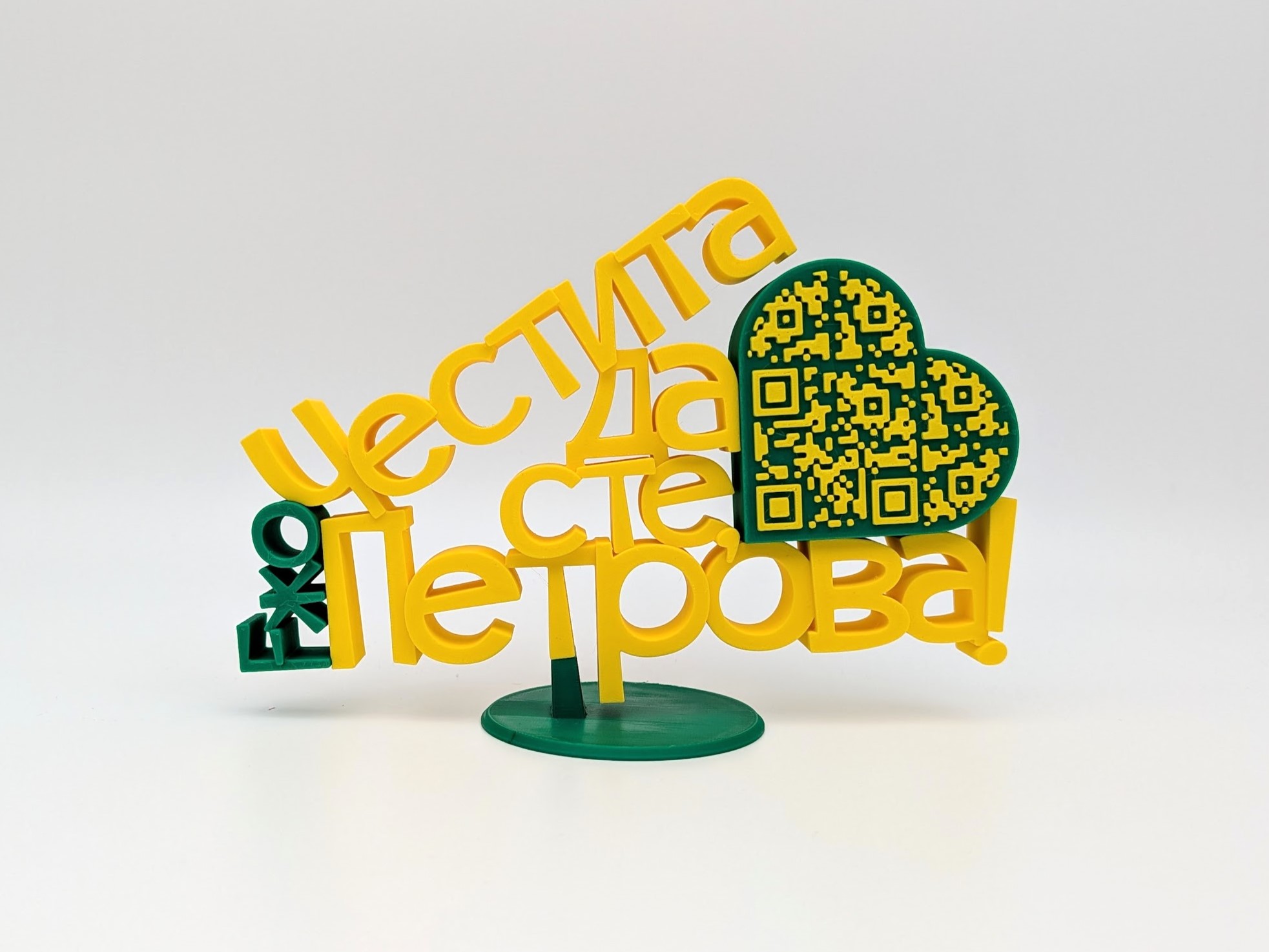 Триизмерният колаж е изработен върху стойка, която включва две разноцветни емоджита, илюстрации или QR код. Това е перфектното решение за всеки, който иска да превърне своето лого в триизмерна табела. С тази алтернатива на обикновената поздравителна картичка, вие ще бъдете в състояние да добавите богатство и цветове към вашата декорация или да подарите на някого специален нещо, което ще задържи спомена за специалния ден.
