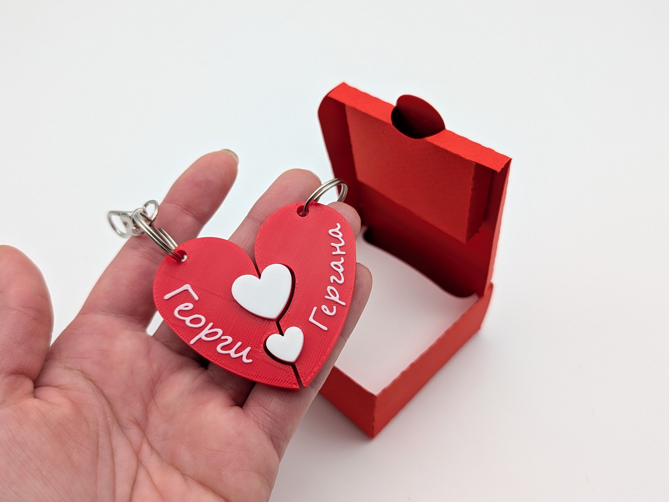 Ключодържател във формата на разделящо се сърце с имена. Романтичен подарък за вас и вашата половинка.