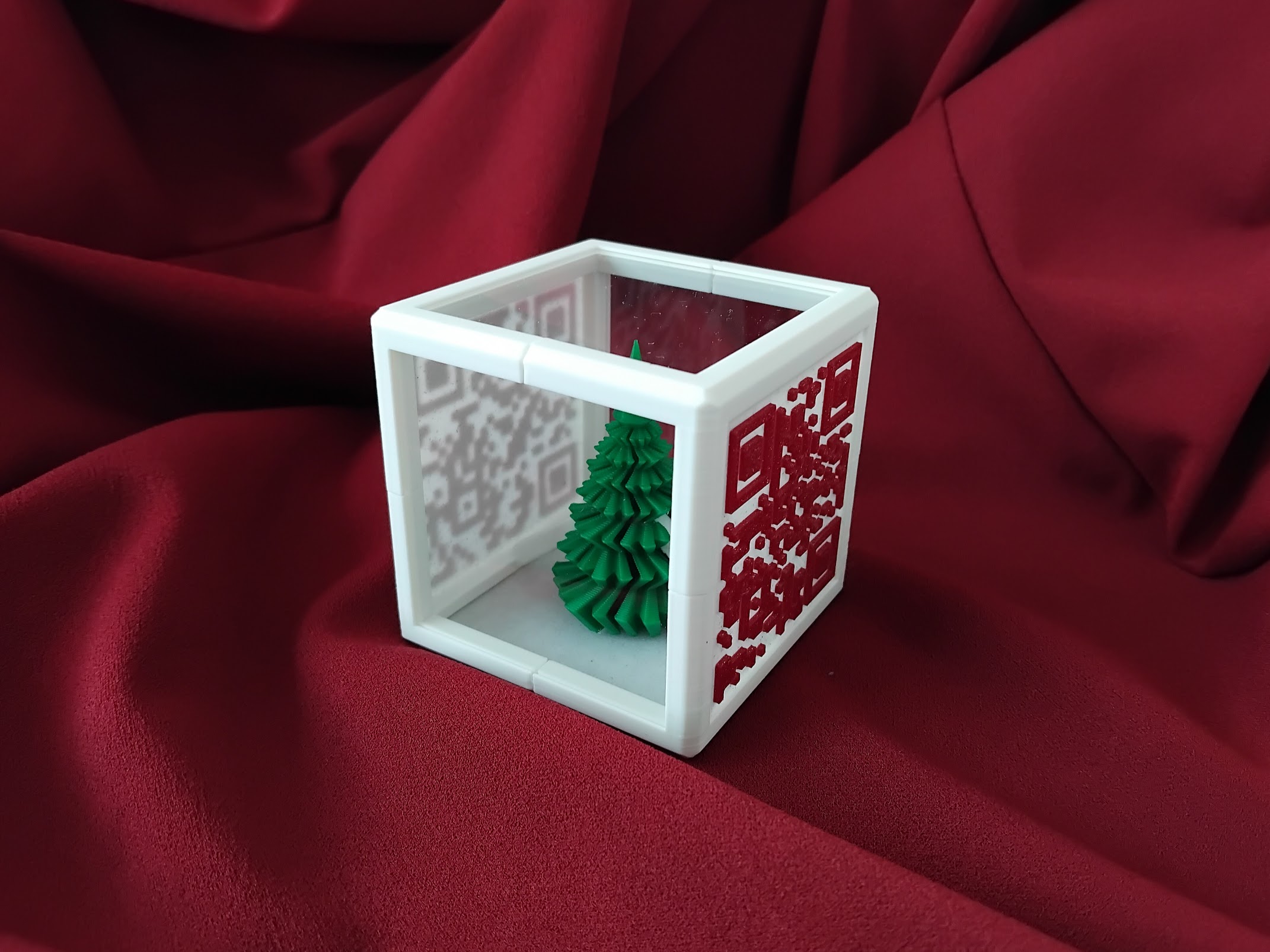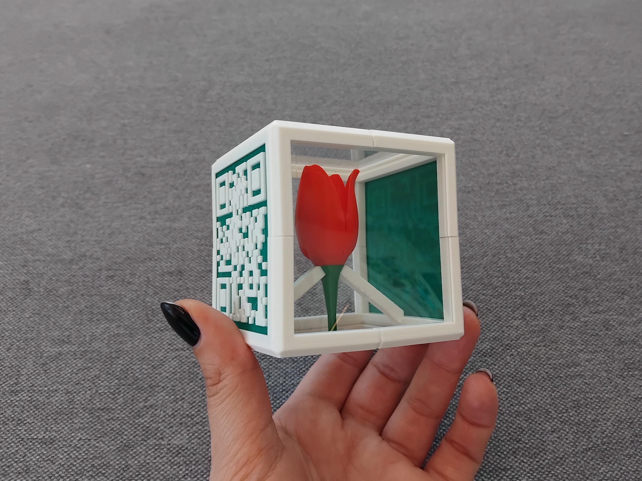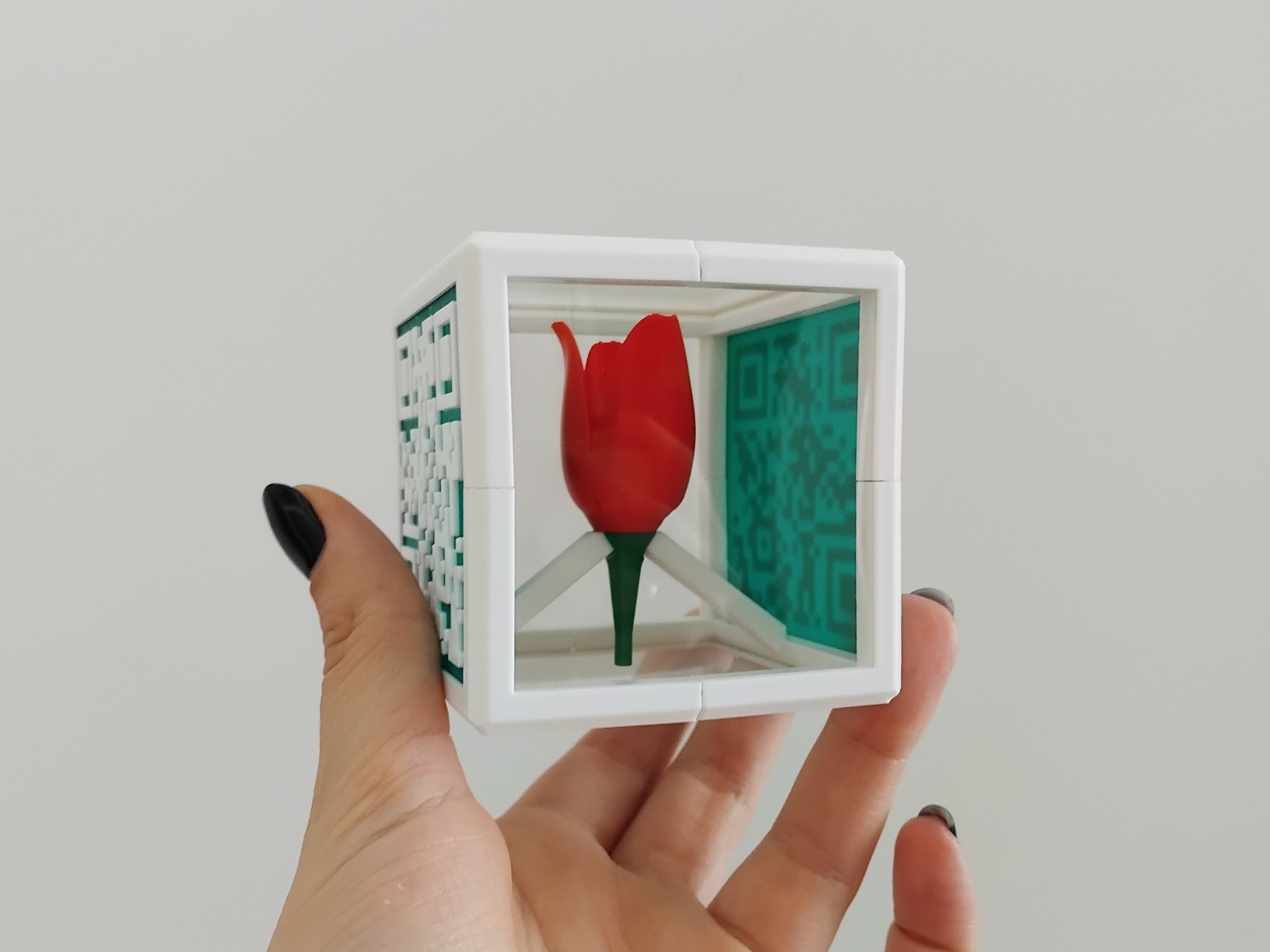 Декоративно кубче с цвете, което съдържа послание в QR кода изобразен на 3 от страните си.