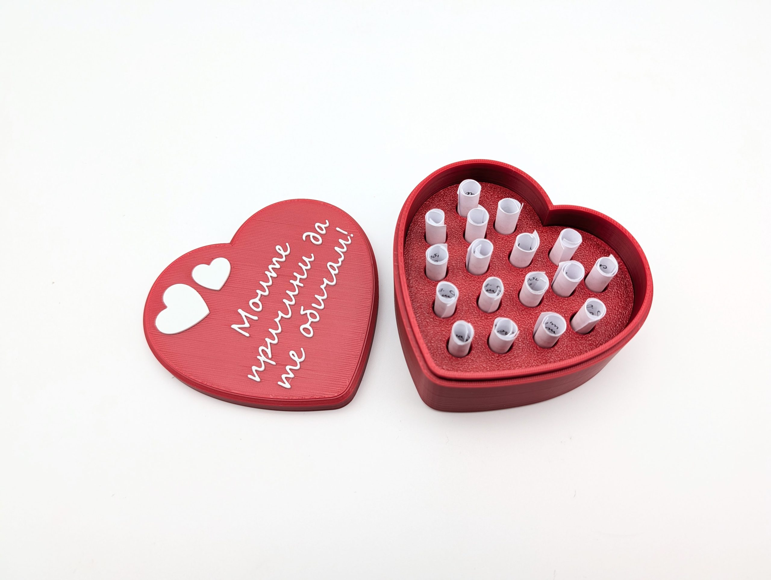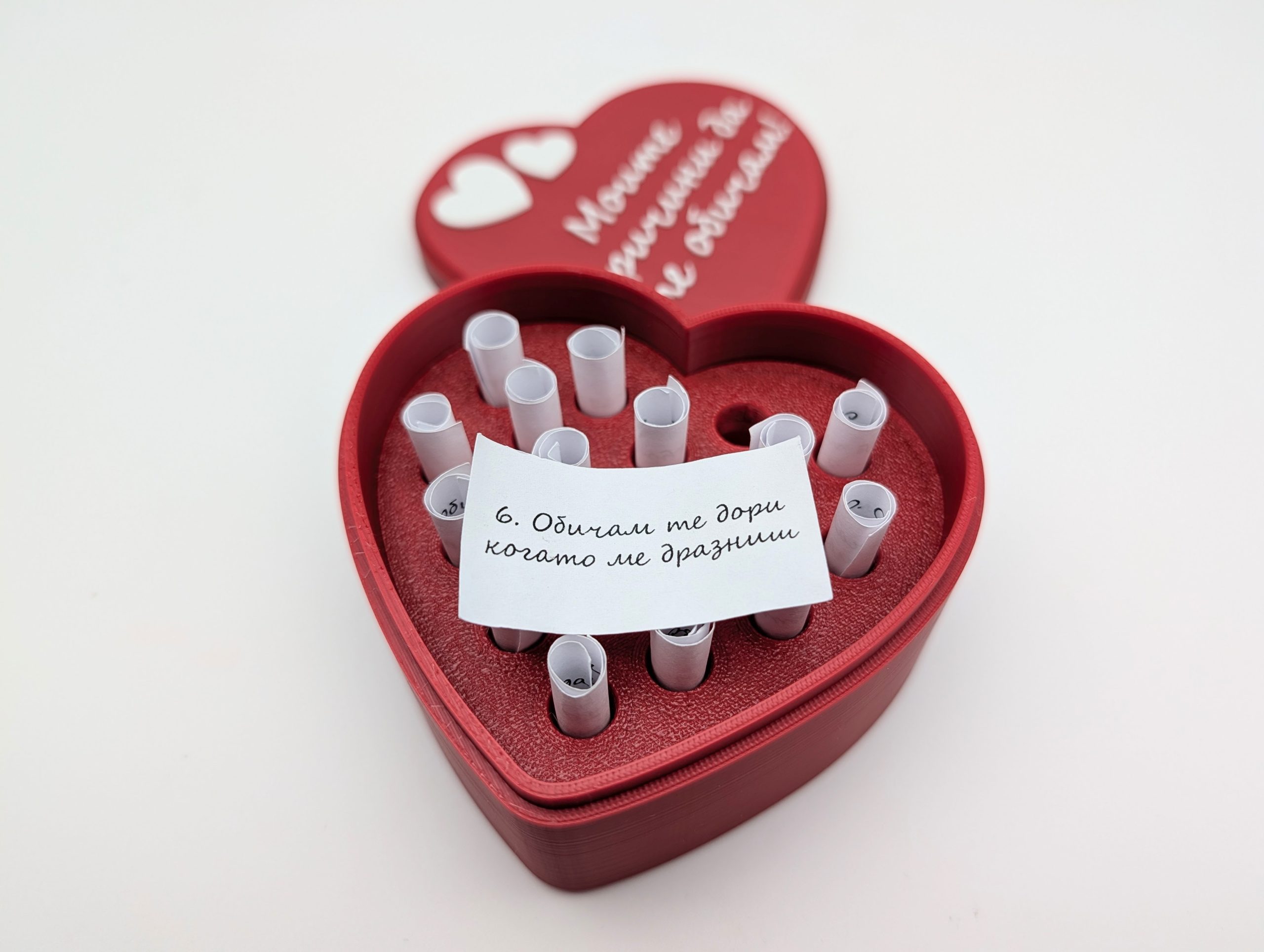 Един от основните акценти на Романтичната кутия е възможността за персонализация. Можете да изберете нашите 17 предварително подготвени пожелания или да добавите свои собствени. Имате свободата да промените само някои от пожеланията или всички, както и да увеличите или намалите техния брой, за да създадете напълно уникално преживяване за получателя.
