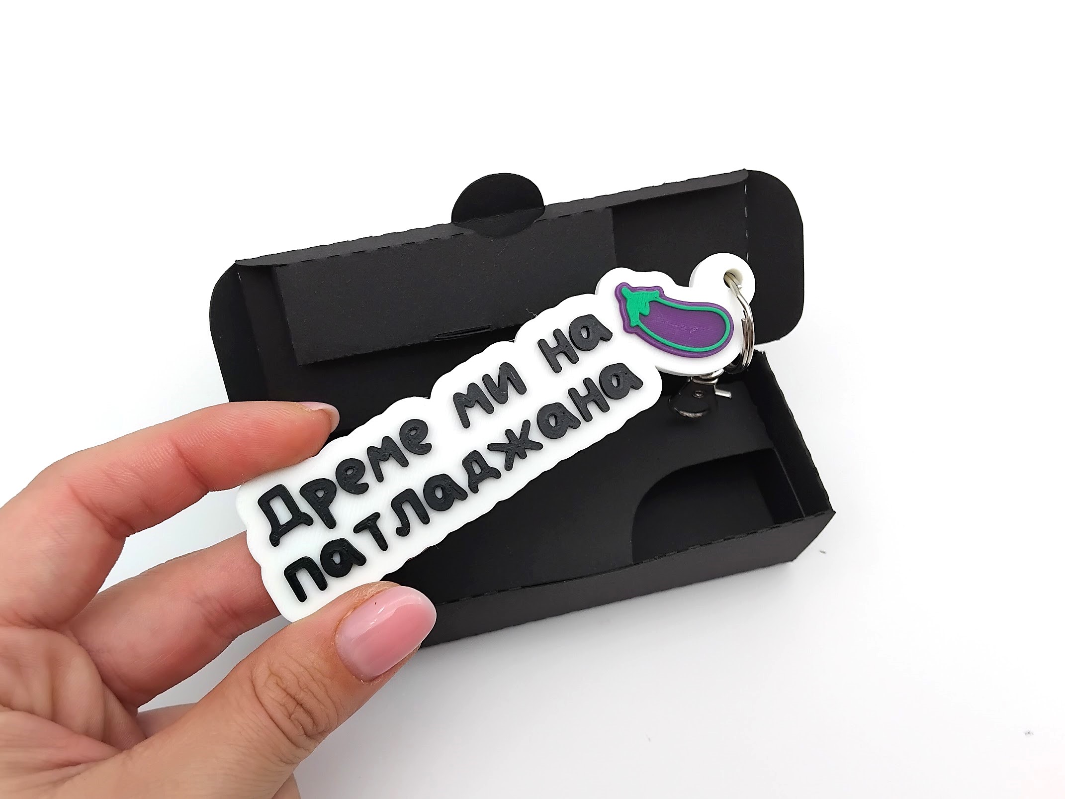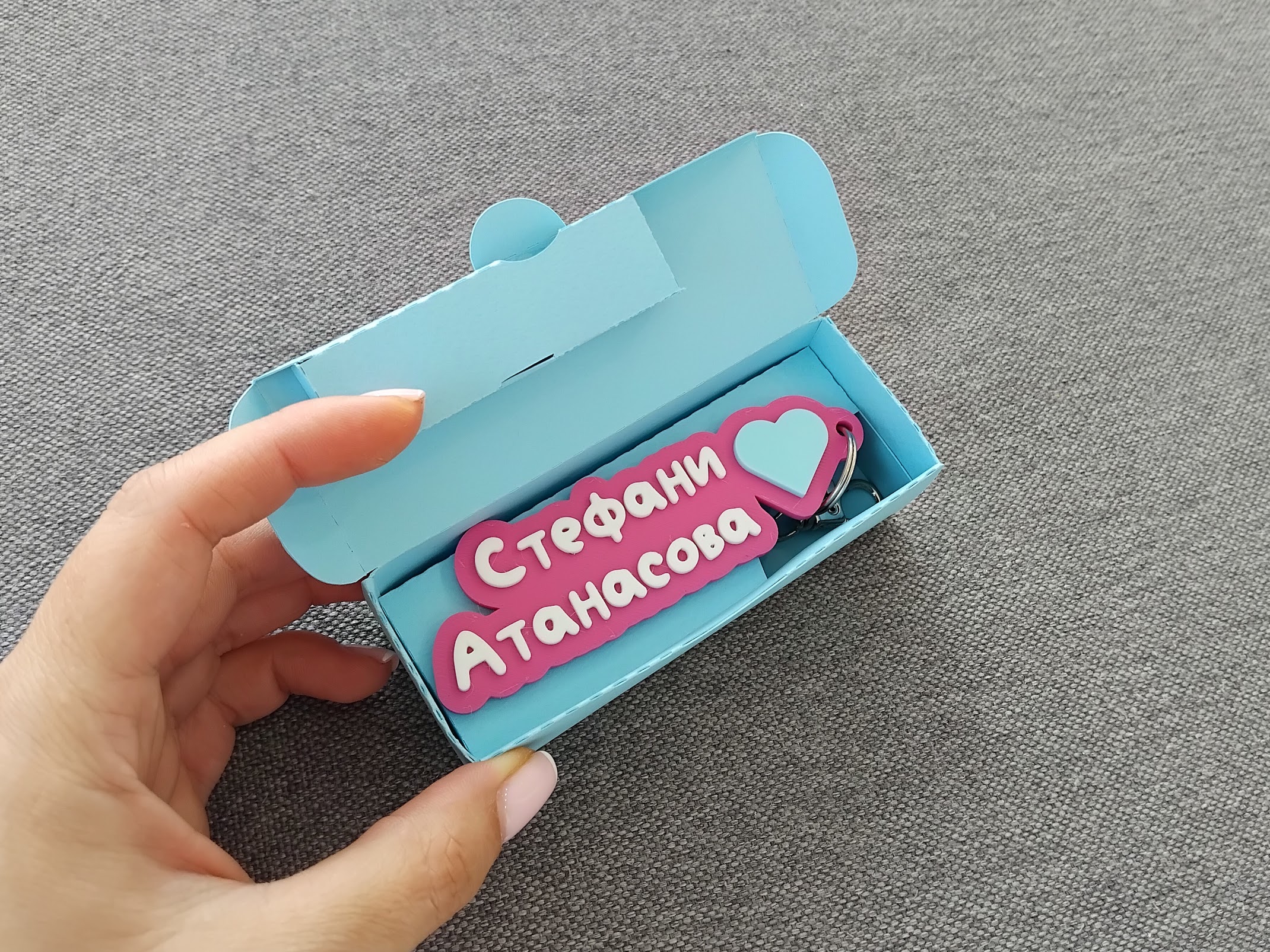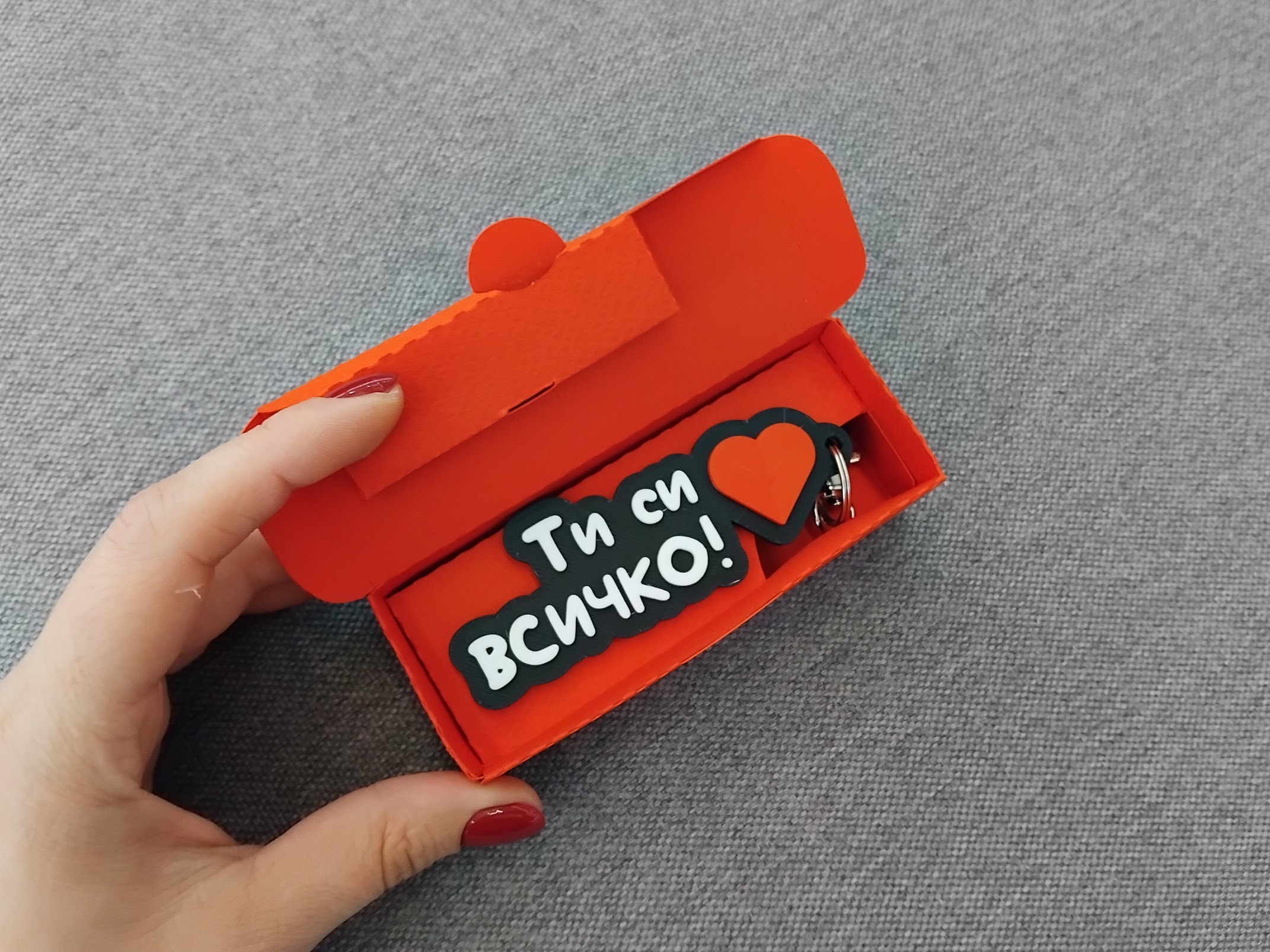 Предлага се в 2 размера – оригинален и умален. В умален размер, ключодържателят е около 1.5 пъти по малък, като дължината зависи от текста и емоджитата. Оригинално, широчината на ключодържателя е около 4-4.5см, дебелината е 0.6см. В умален размер широчината е 2.5-3см а дебелината 0.4см. Моля, имайте предвид, че емоджитата в умален размер са с по-малко детайли. Препоръчваме ❤️ и 💋.